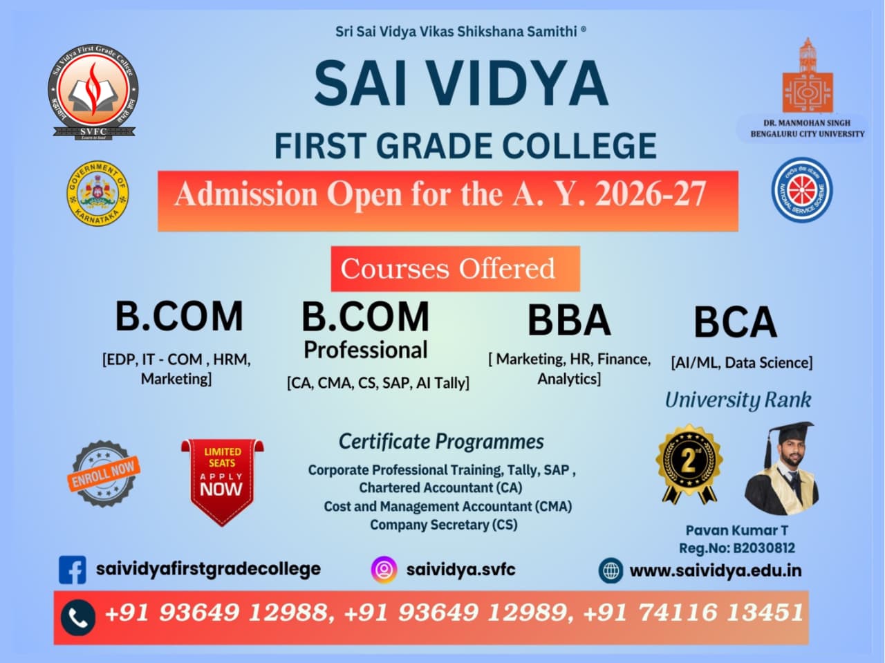 Sai Vidya First Grade college, affiliated to Bengaluru City University (BCU), Bengaluru, Karnataka, Recognized by the Government of Karnataka, was established in the year 2020 by